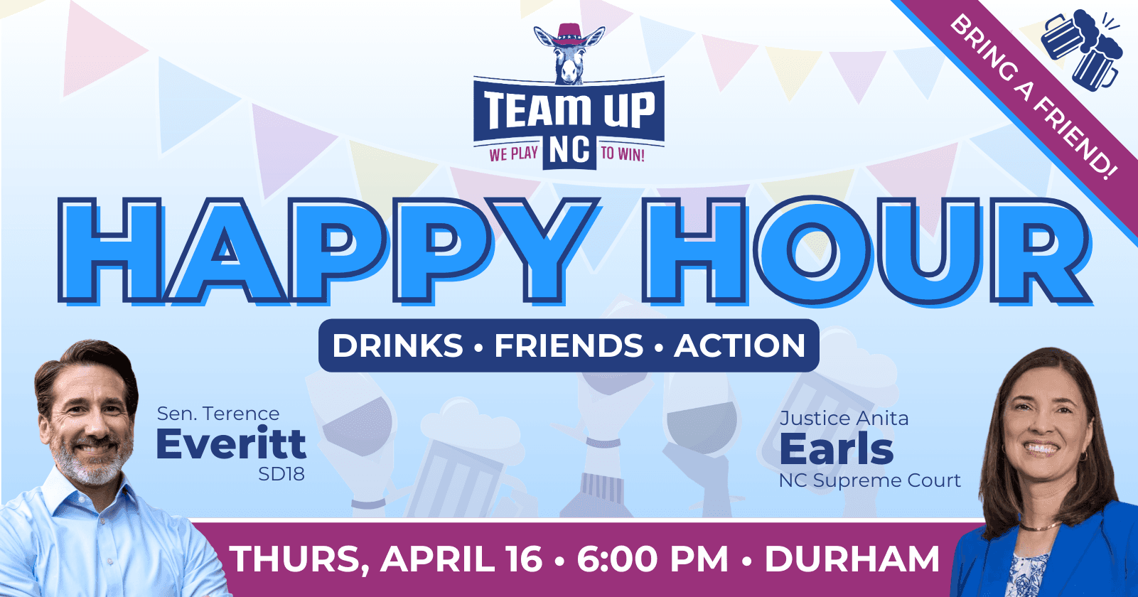 Join us on Thursday, April 16th for a Happy Hour in Durham! Grab a friend (or three!) and let us treat you to a drink! Join other Team Up NC volunteers and learn more about all of the activities we have planned for the Spring. Special guest speakers include Senator Terence Everitt and Justice Anita Earls.
