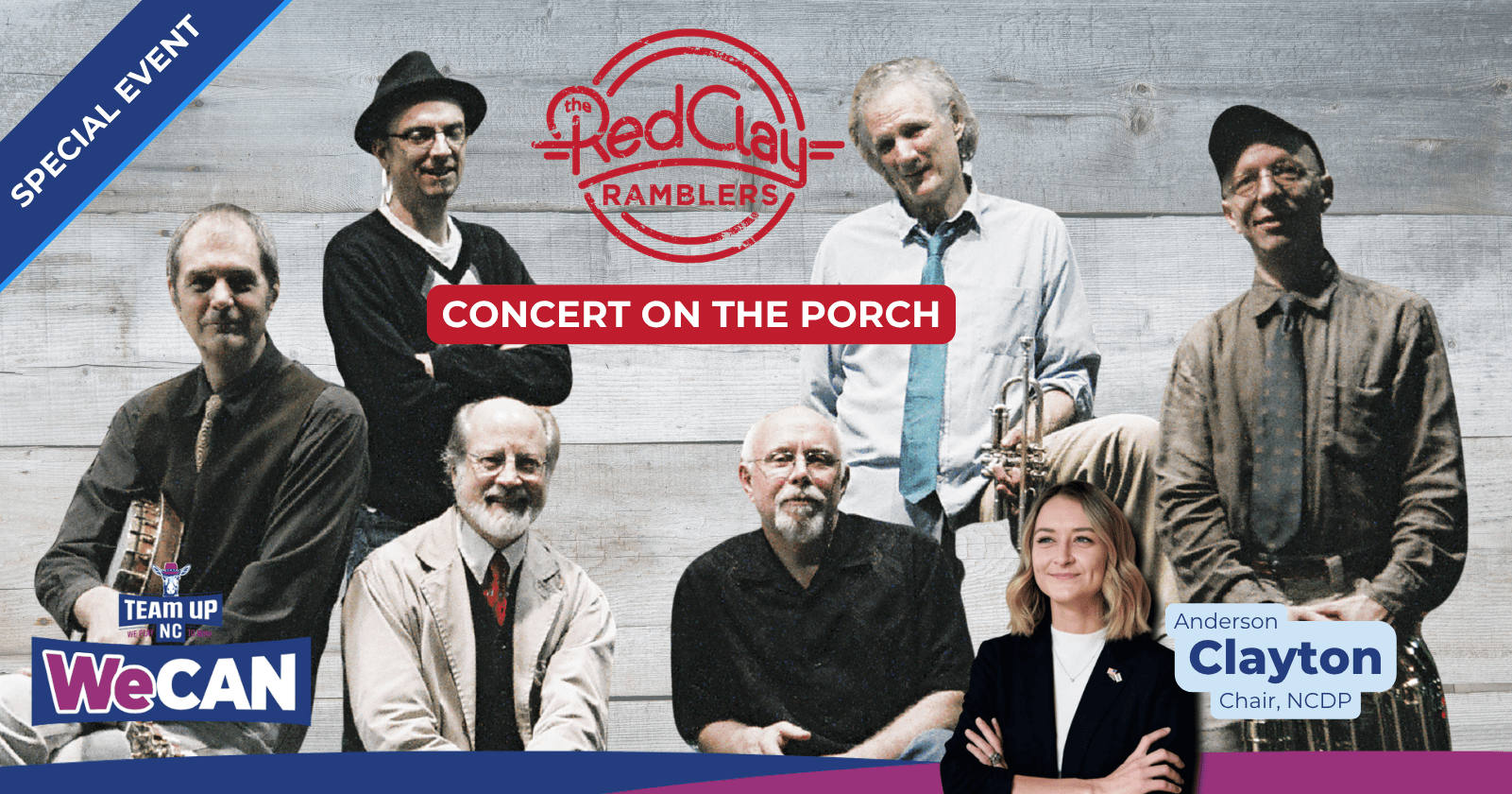 Come gather on the front porch with with The Red Clay Ramblers — lift your spirits and find some hope! NC Democrats have a clear path to change NC for the better by increasing our power in 2026. We can gain more seats in the NC House and Senate, ensure Supreme Court Justice Anita Earls stays on the bench, and elect Roy Cooper to the US Senate.