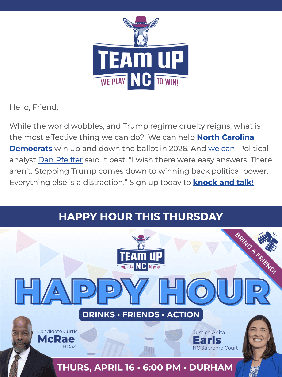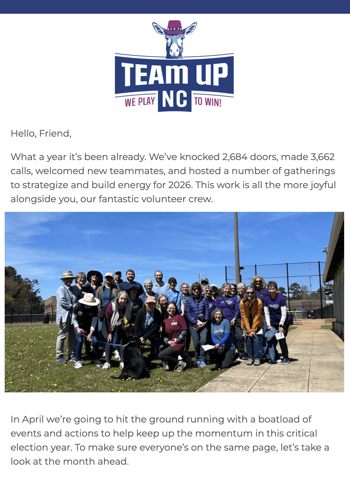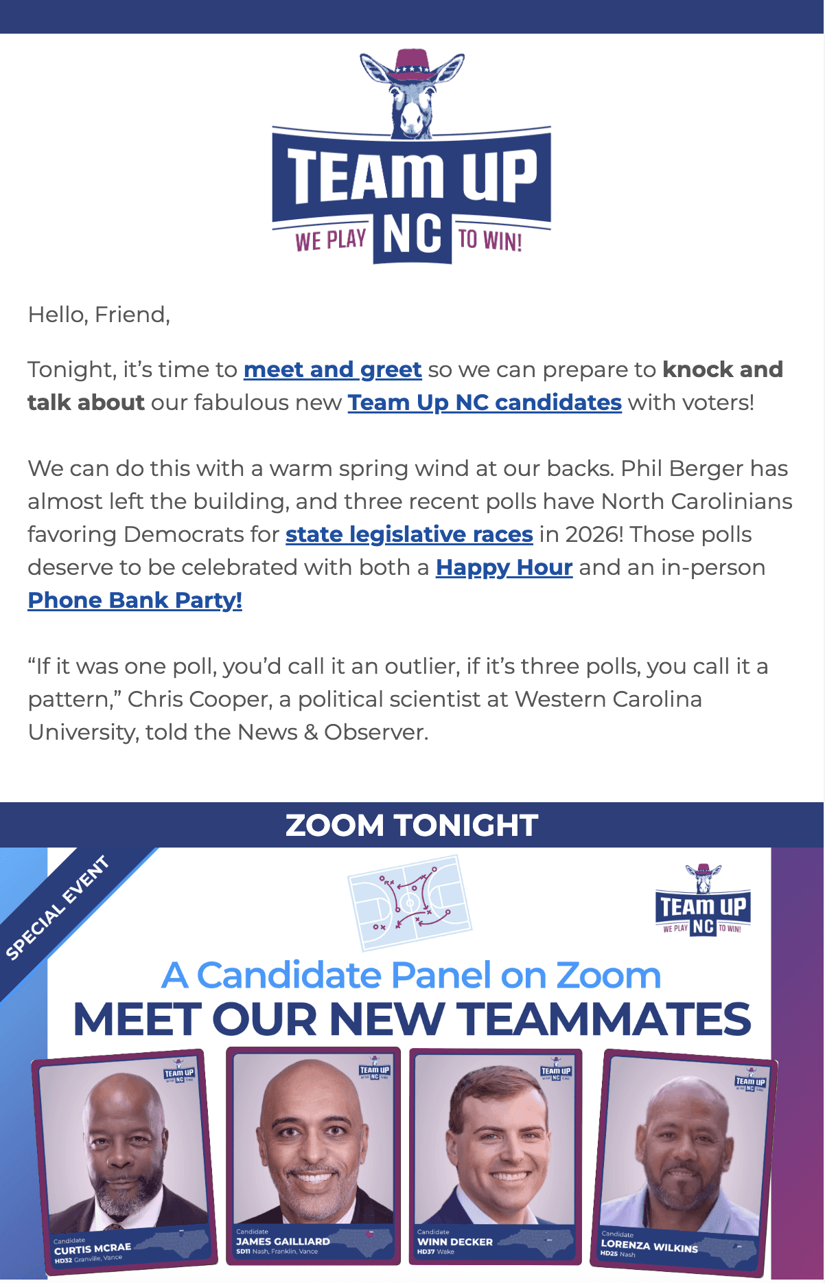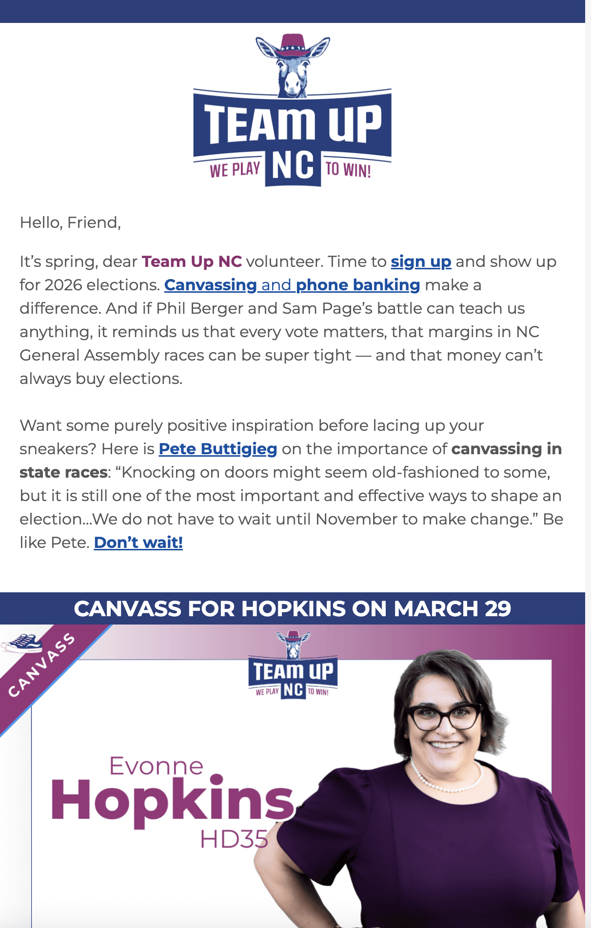Get weekly updates about events, phone banks, canvasses, and other activities.